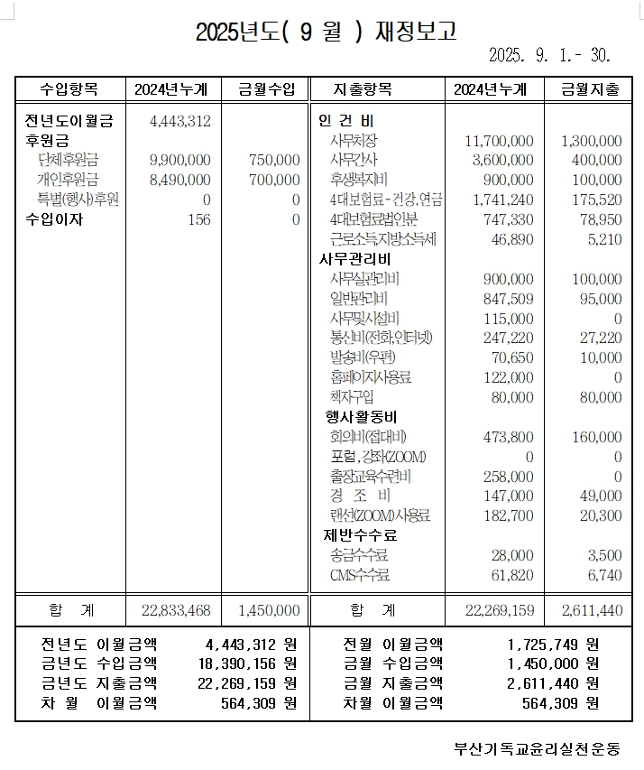 [부산기윤실 2025년 9월 재정보고]
